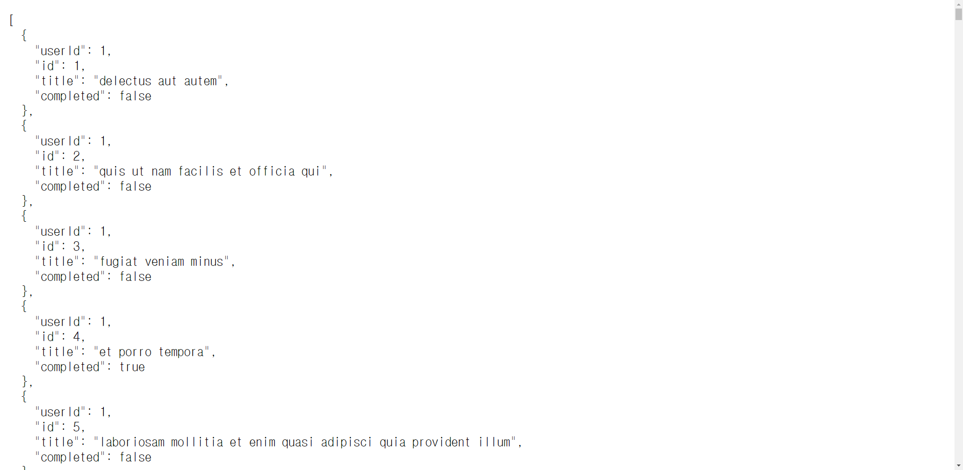 인터넷 주소창에 ( https://jsonplaceholder.typicode.com/todos ) 입력하고 들어가면 GET 메소드로 API를 쏴볼 수 있다.