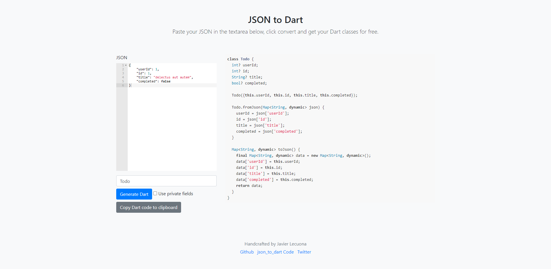 JSON to Dart Paste your JSON in the textarea below, click convert and get your Dart classes for free. Handcrafted by Javier Lecuona Github json_to_dart Code Twitter